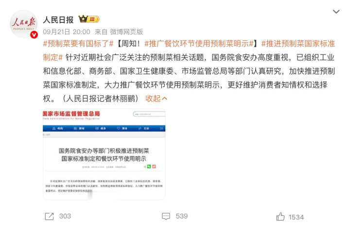推进制定预制菜国家标准,多家媒体发文关注。(图/社交媒体截图)